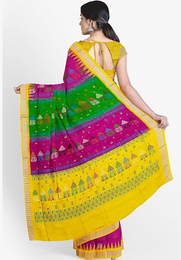 silk saree with blouse piece(Peacock motifs in pink color base with multi color pallu)