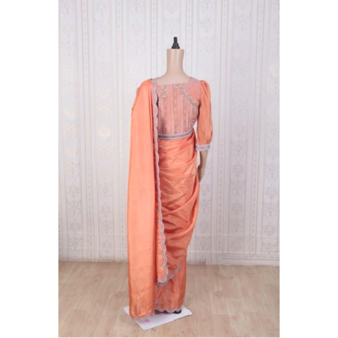 Women Cotton Scalloped Habutai Silk Saree Heavy Maggam Work With Lining