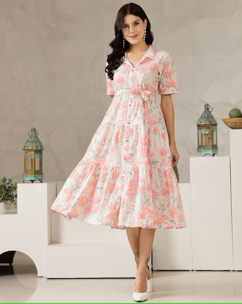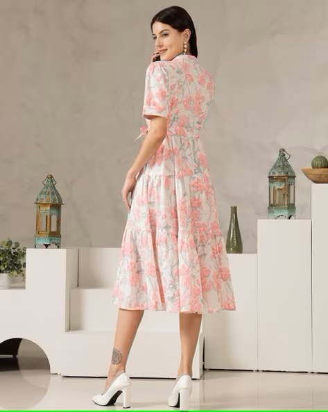 Women Floral Print Tiered Dress with Short Sleeves