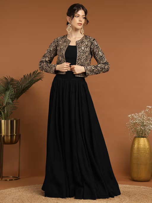 The Punyah Set Is A Luxurious Celebration Of Indian Heritage and Artisanal Craftsmanship, Designed To Make A Bold Impression. This Three-Piece Set, Featuring A Short Jacket, Blouse, and Skirt, Is Crafted In Timeless Black, Exuding Elegance and Sophistication. The Short Jacket, Made From Premium Silk and Adorned with Intricate Embroidery, Adds A Layer Of Opulence. Paired with A Simple, Refined Skirt Also In Silk, This Outfit Is Perfect For Those Seeking A Blend Of Tradition and Modern Style. Ideal For Weddings, Festive Gatherings, Or Formal Events, The Punjab Set Showcases The Beauty Of Classic Indian Attire.