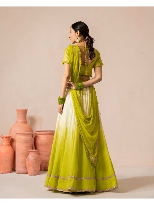 Indulge in elegance with this green lehenga set from Goldys Nestt. Made from high-quality cotton, the choli features half sleeves, a sweetheart neckline, tie-ups closure, and a ombre pattern, finished with a mid-waisted lehenga and a stylish dupatta. Style it with minimal jewellery and sandals to complete the ensemble.