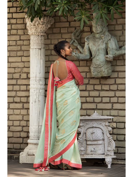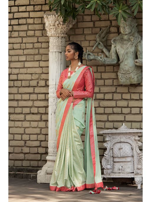 Inculcate a combination of style and panache to your wardrobe with this look from Nikasha. This pista double paneled jaipuri guldasta and chotu sanga crepe saree paired comes with rose pink chevron gold print cambric blouse. Style this look with brown juttis, heavy chanbalis and a matching clutch.