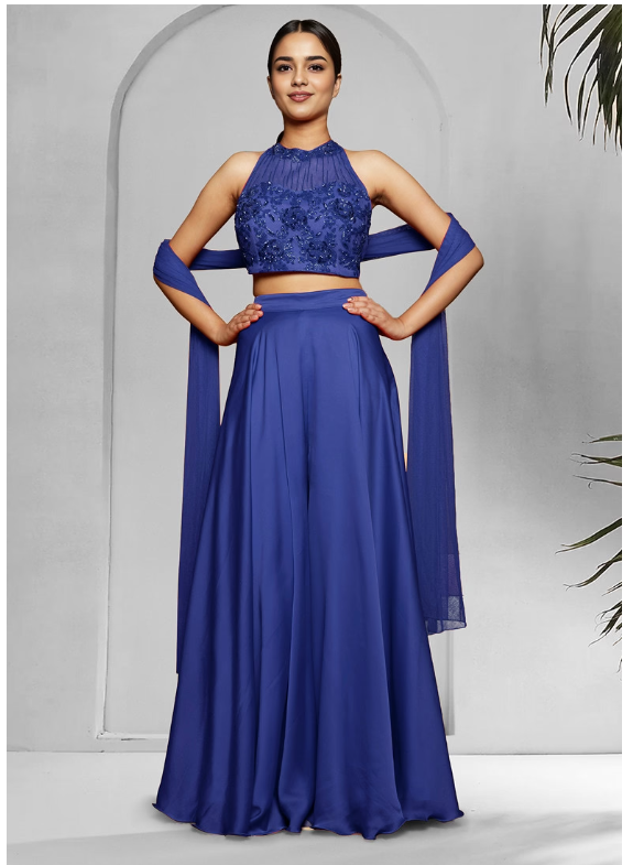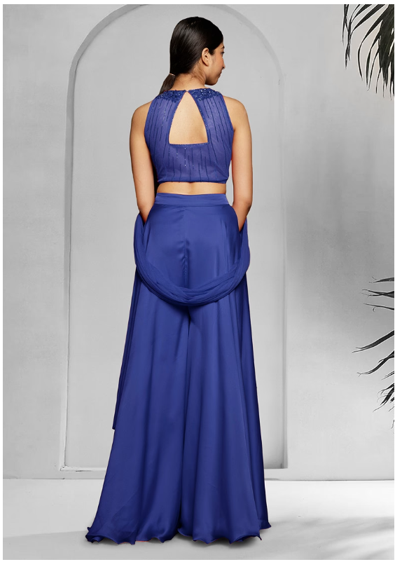 Blue Palazzo Set With Hand Embroidered Blouse And Dupatta