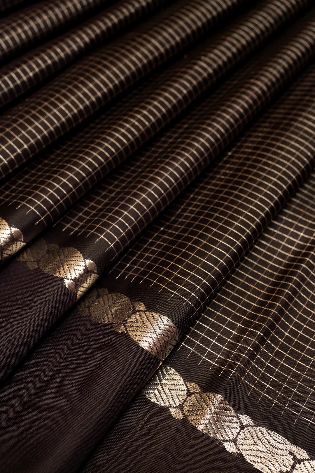 This Black Silver Zari Checks Pure Kanchipuram Silk Saree presents a timeless, minimalist design. The eye-catching handloom saree boasts silver zari checks for a subtle, fashionable touch. Appropriate for elegant events, this saree will ensure a lasting impression.
