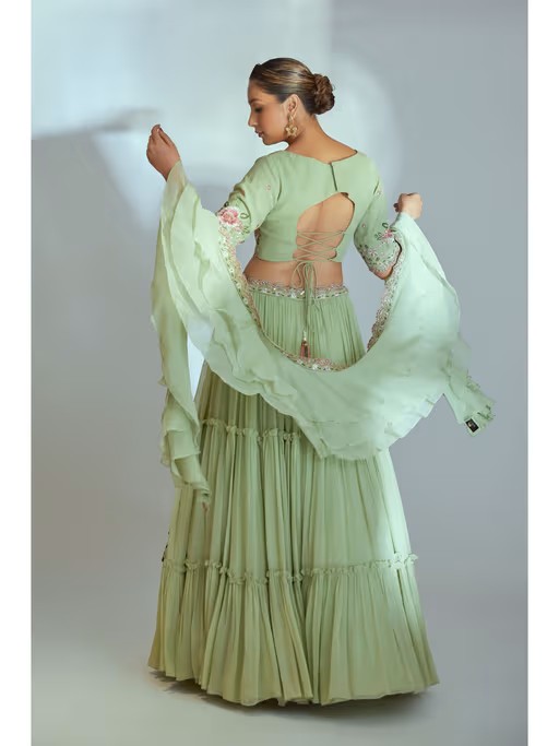Adorn the styles specially made for you with this green set from Suruchi Parakh. Made from high quality georgette, it features hook and eye closure and embroidered pattern along with half sleeves & v-neck design. Pair it with trendy footwear to elevate your look.