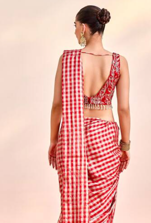 Red Tissue, Silk Cut Work, Checkered Print Saree And Floral Embroidered Blouse