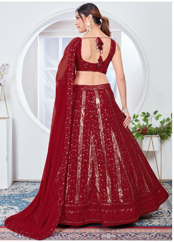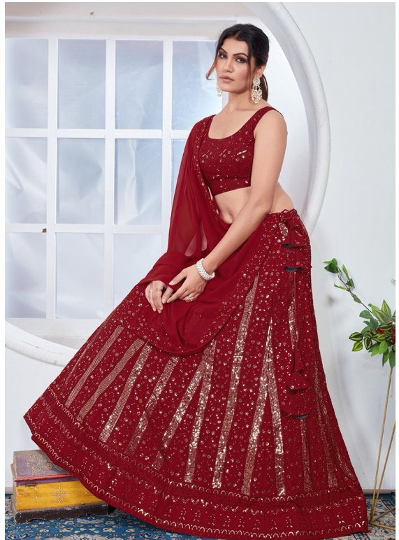 Step into elegance with this stunning Red Sequin Thread Embroidered Faux Georgette Lehenga Set, designed to turn heads at every celebration. A beautiful blend of tradition and trend, it's your perfect pick for any grand event.