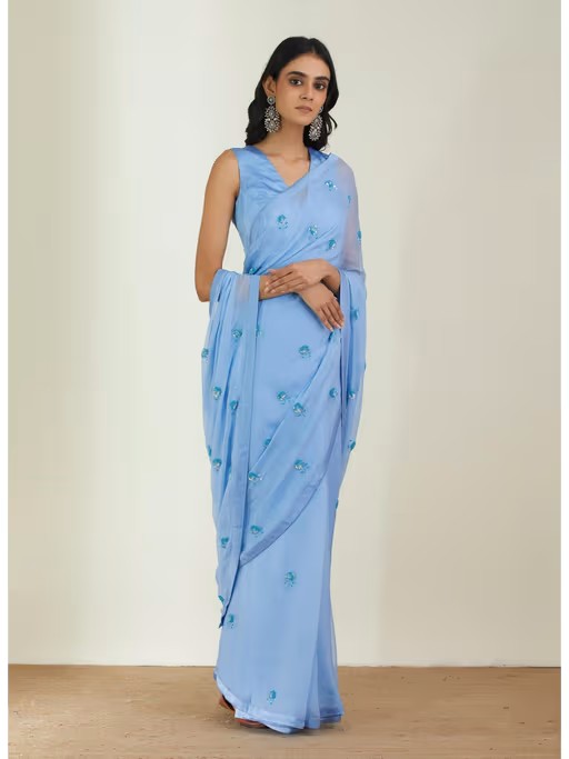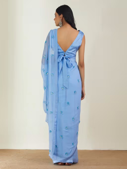 Elevate your ethnic wear wardrobe with Label Earthen blue saree, stitched blouse. It features floral pattern with sleeveless, v-neck with , bottom style . It is crafted from finest material. This outfit is perfect for special occasion. Add trendy footwear to complete the look.