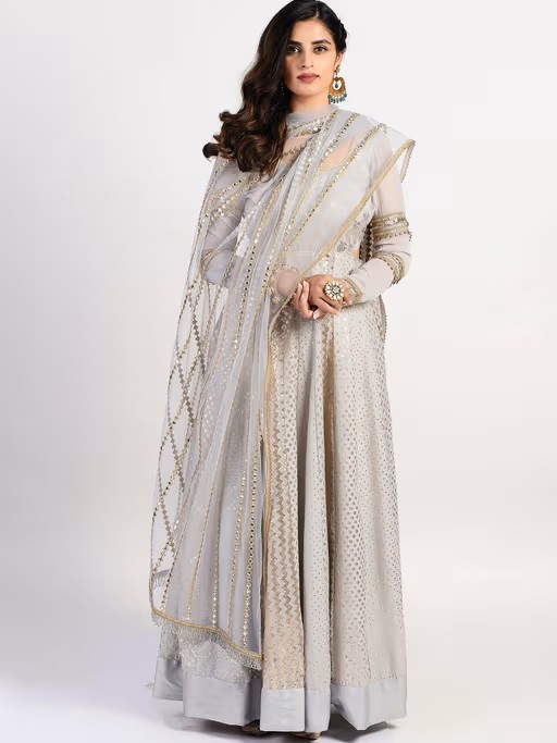 Featuring a silver-grey anarkali enhanced with cut-outs at the sides and embellished with sequins and lace on the sleeves giving a complete ensemble with intricate mirror embroidery on dupatta. Wear this look for a friend's wedding or during a family member's reception. Enhance the look with colourful kundan earrings.