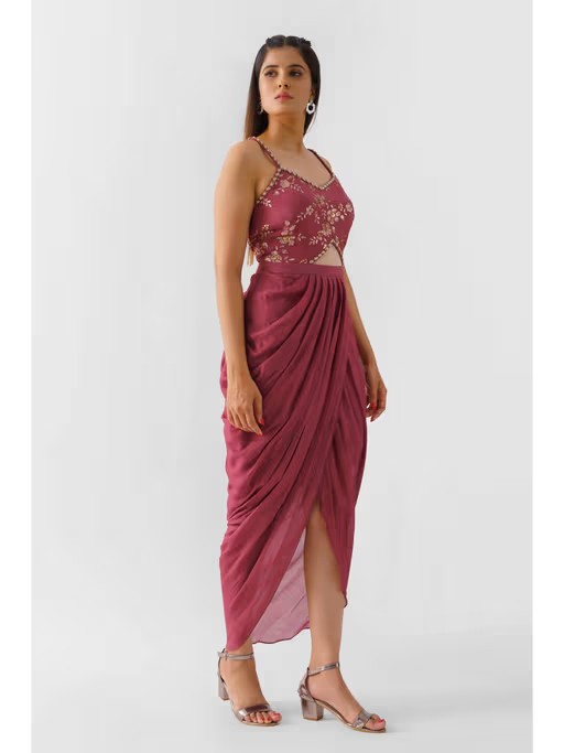 Adorn the styles specially made for you with this mauve set from Suruchi Parakh. Made from high quality georgette, it features pull on closure and embroidered pattern along with sleeveless & shoulder straps design. Pair it with trendy footwear to elevate your look.