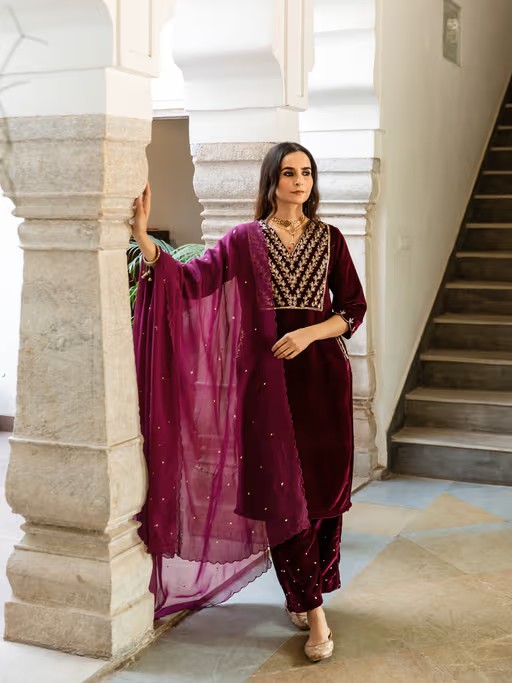 VOur Roya Set Is Dipped In A Vintage Glam Neck With Antique-Inspired Zardozi, Moti Daba And Cutwork Embellishments.This Is A 3 Piece Set. Kurta -A Hand-Dyed Velvet Kurta Is Embellished With Zardozi And Moti Daba Work Pant - It Is Paired With Matching Velvet Silk PantsDupatta - A Matching Organza Dupatta With Cut Work Embroidery Completes The Look.