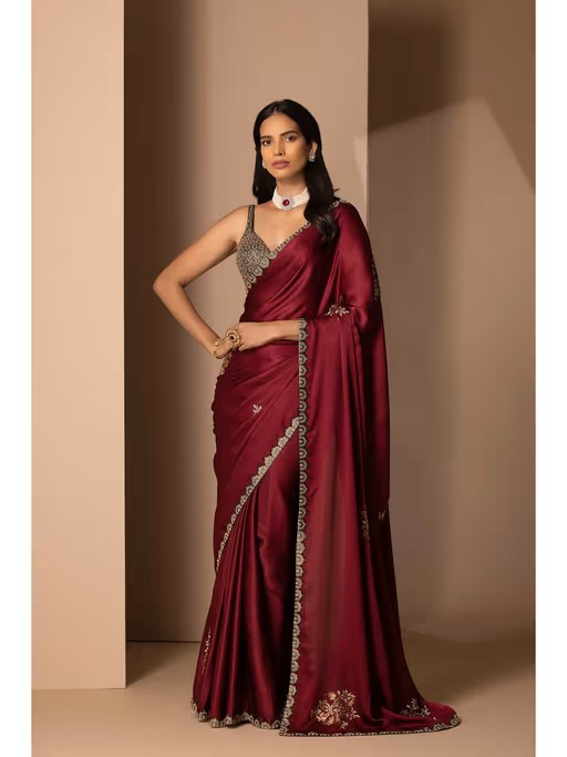 A Maroon Organza Saree Embellished with Rhinestones Border, Paired with Crepe Cut-Sleeves Blouse. Fabric : Organza (Saree) and Crepe (Blouse)Colour - Maroon