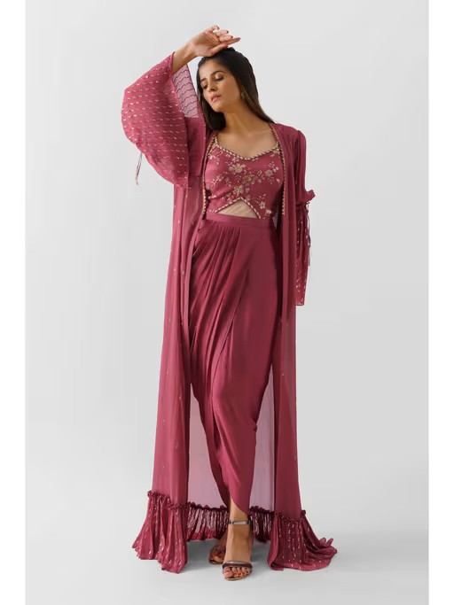 Adorn the styles specially made for you with this mauve set from Suruchi Parakh. Made from high quality georgette, it features pull on closure and embroidered pattern along with sleeveless & shoulder straps design. Pair it with trendy footwear to elevate your look.