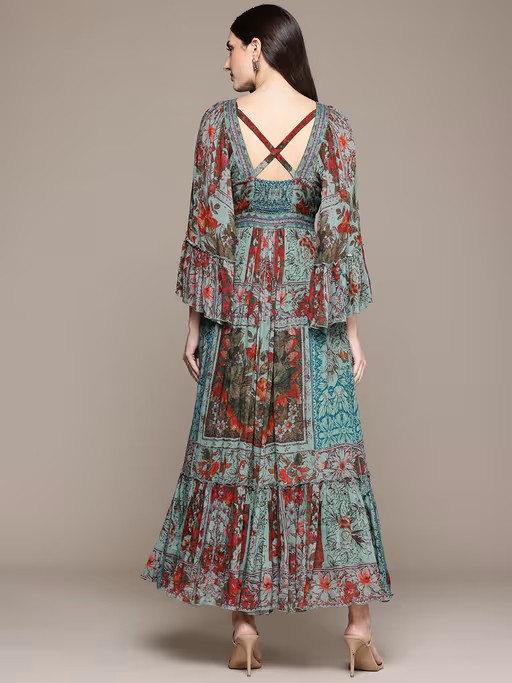 Elevate yours style with this green dress from Ritu Kumar. Crafted from viscose, this beautiful dress is finished with flared sleeves and a V-neck. Style it with a pair of heels and stud earrings.