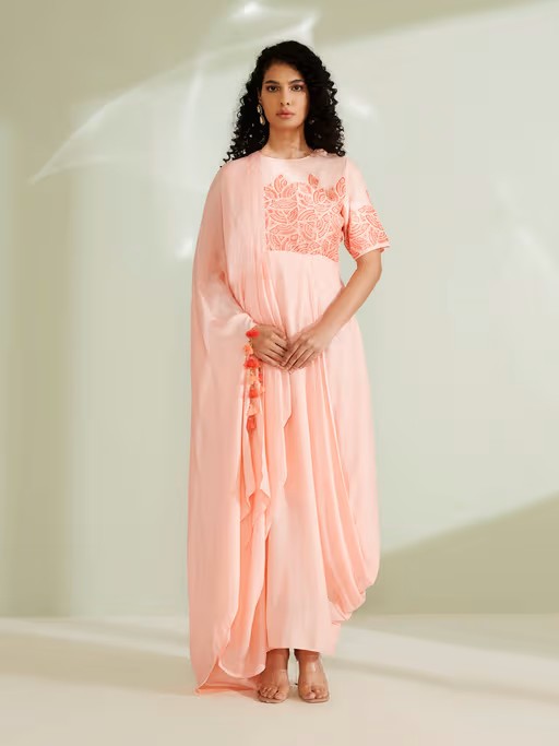 Embrace sophistication with this peach dress from 1999AD. Made from high-quality silk, the dress features half sleeves, a round neck and a sequined pattern. Style it with minimal jewellery and sandals to complete the ensemble.