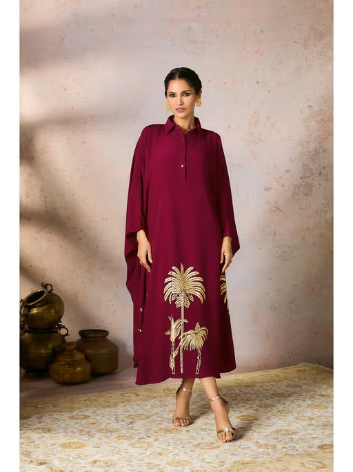 Burgundy Foil Print Kaftan Dress with Slip (Set of 2)