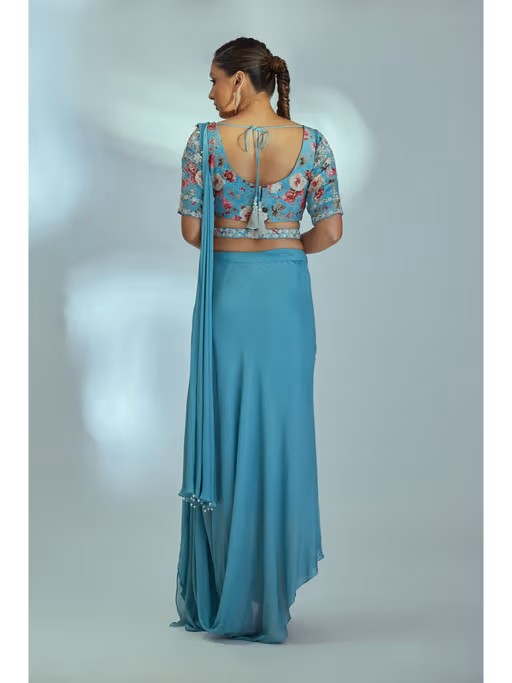 Adorn the styles specially made for you with this blue set from Suruchi Parakh. Made from high quality georgette, it features hook and eye closure and embroidered pattern along with half sleeves & round neck design. Pair it with trendy footwear to elevate your look.
