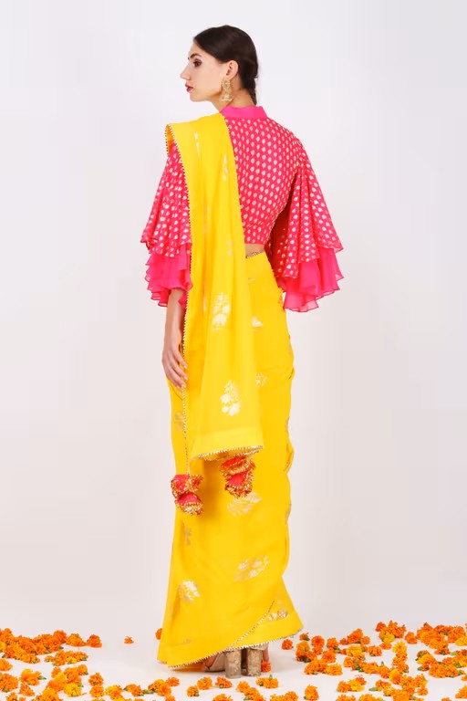 This yellow saree by Nikasha is crafted in georgette with jaipuri guldasta foil prints and samosa lace detailing. It is paired with a rani pink georgette blouse with bell sleeves featuring jasmine bud foil prints. This look is ideal for wedding sangeet and mehendi functions. This product can be customised to your requirements for size or colour. Please use the Nykaa Fashion App, and click on the whatsapp icon to get in touch with our customisation experts to place your order.