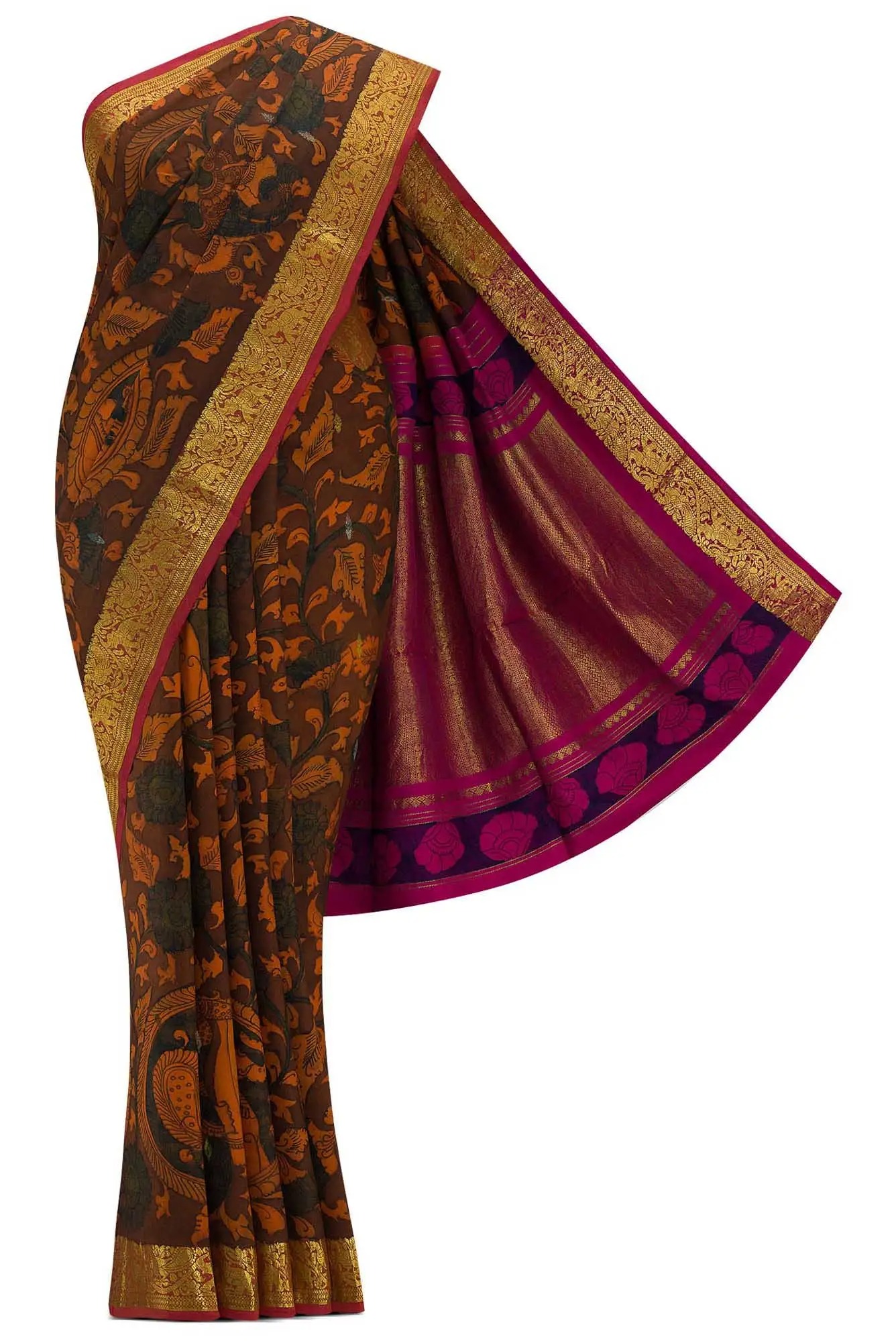 Brown Dual Tone Kanchipuram Silk SareePrinted design on the body and Zari Border. Includes unstitched blouse.