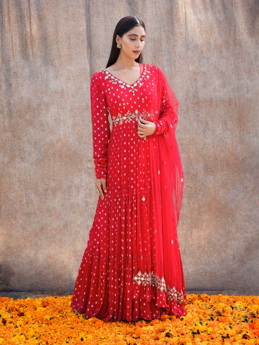 Elevate your ethnic wardrobe with the timeless elegance of the Silky Bindra kurtas kurtis and tunics collection. It features premium quality georgette fabric . Whether you are attending wedding or special occasion, these kurtas kurtis and tunics are perfect to it. It features mirror work flared sleeves and v-neck . Pair it with heels, carry potli bags and jewellery.