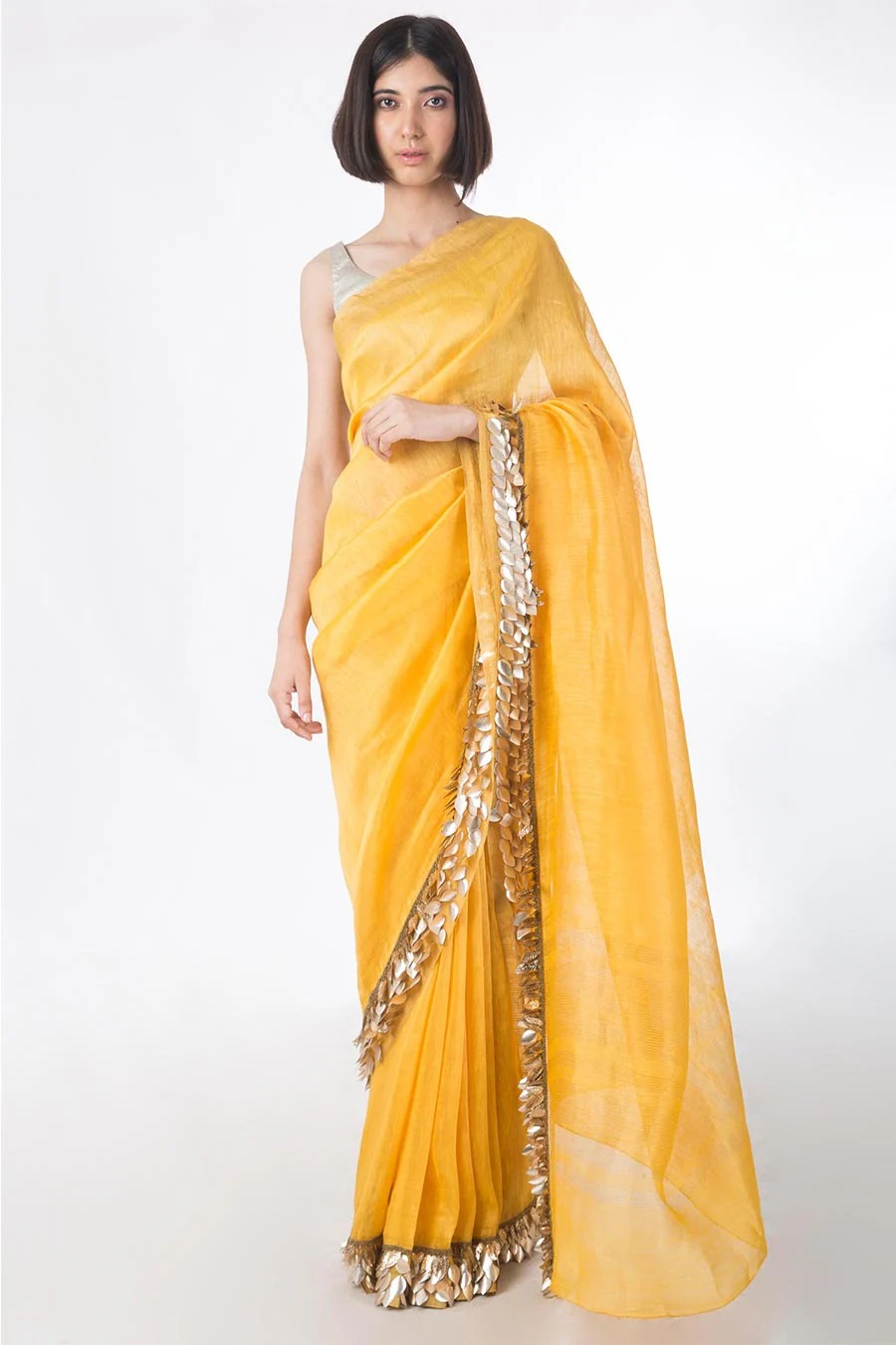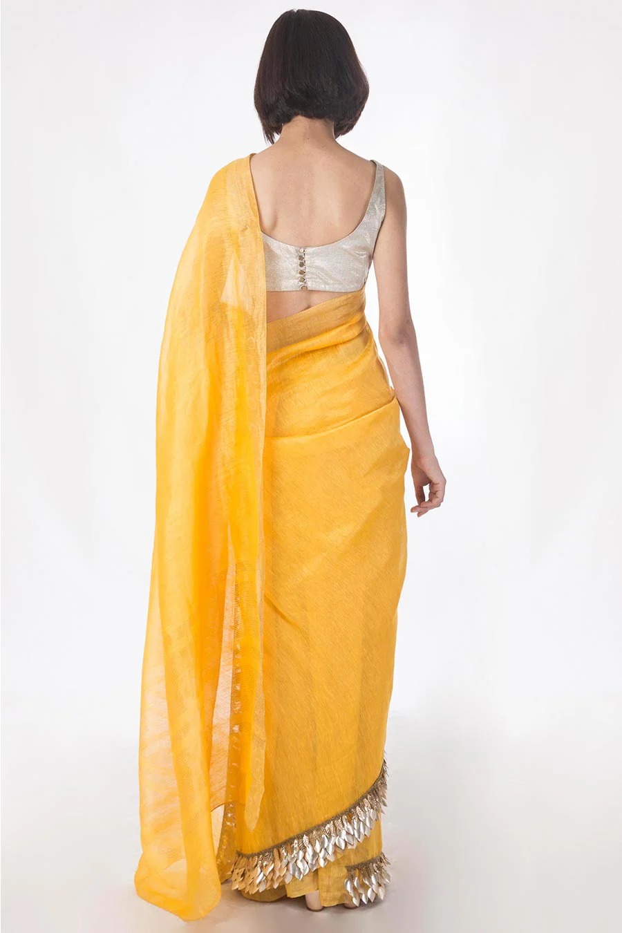 Yellow Embroidered Linen Silk Saree
