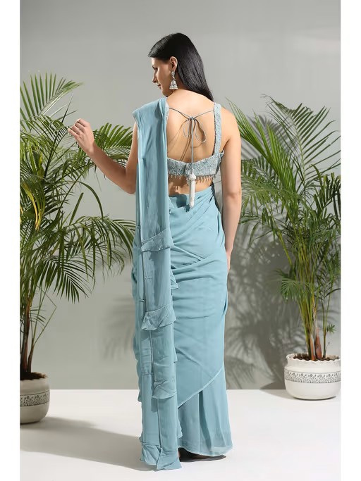 Dust Blue Georgette Saree With Ruffle Pally Detailing, Paired With Thread And Sequin Work Blouse. Completing The Look Is Long Thread Work Jacket In Tassel Detailing
