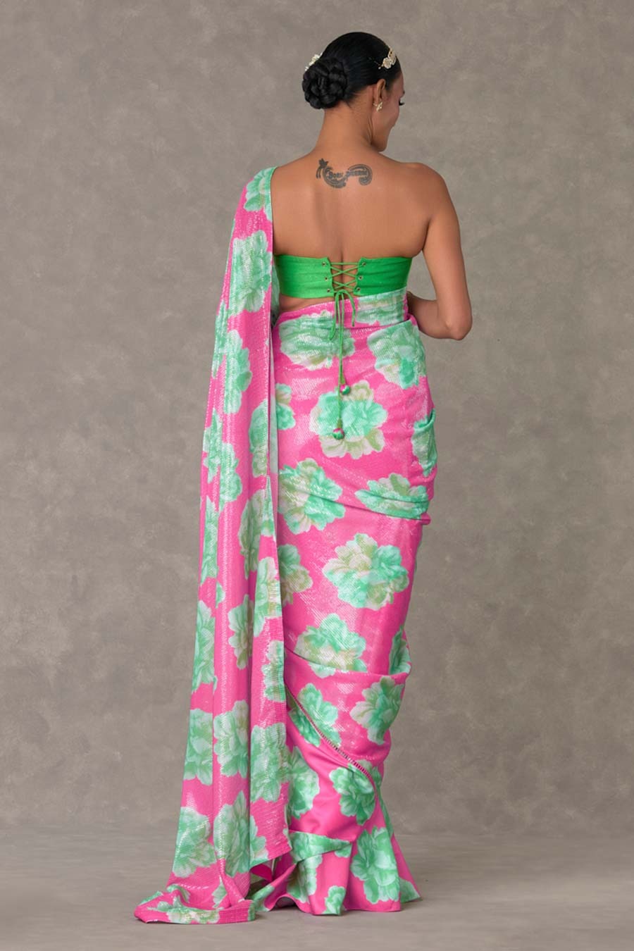 • Material - Saree - Sequinned Georgette and Silk; Blouse - Raw silk