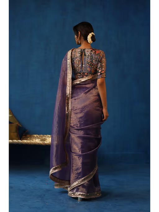 Adorn The Ethnic Hues With This Purple Saree Set From Begum Pret. Made From High Quality Silk, It Features Hook And Eye Closure And Embellished/Sequined Pattern Along With Hook And Eye & Half Sleeves Design. Pair It With Trendy Footwear & Minimal Jewellery To Complete Your Ensemble.