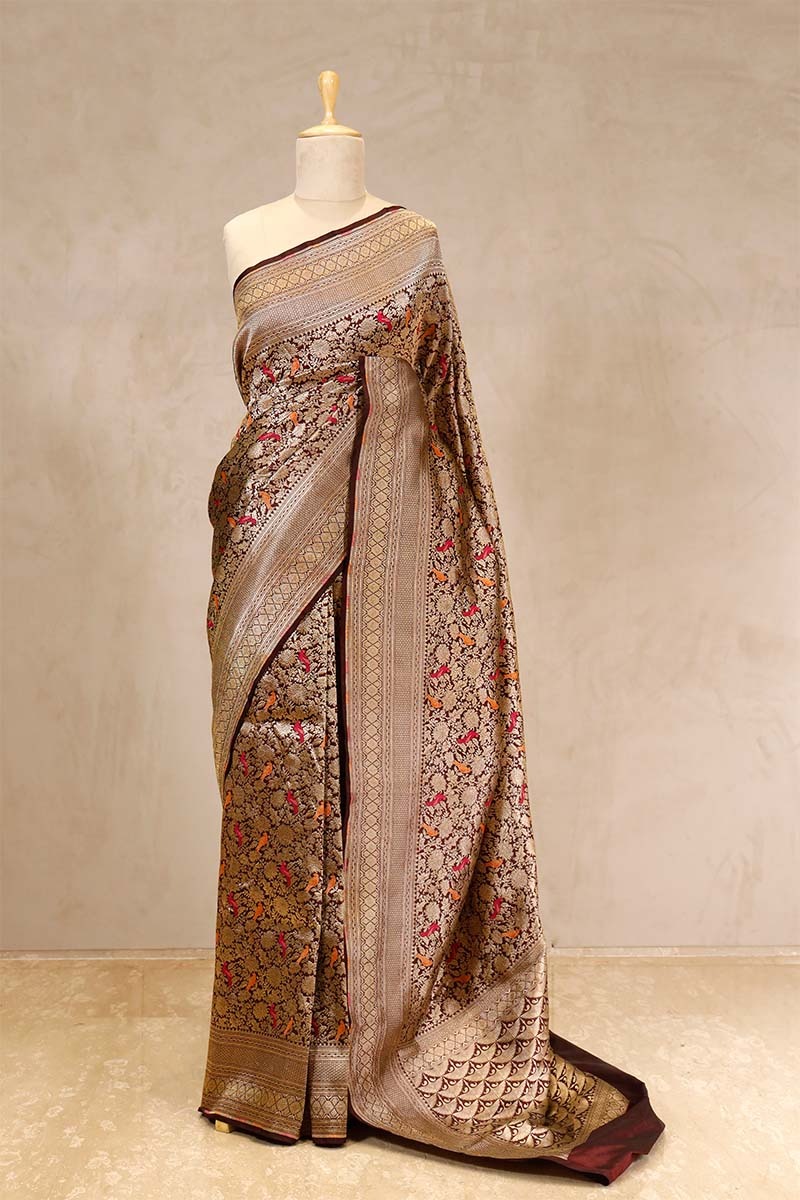 This coffee brown color Banarasi Katan silk saree is woven in a brocade style, featuring intricate gold zari floral jaal work with meenakari bird motifs spread across the body. The border and pallu are adorned with detailed gold zari brocade work. It comes with a matching unstitched blouse piece, perfect for personalized tailoring.
