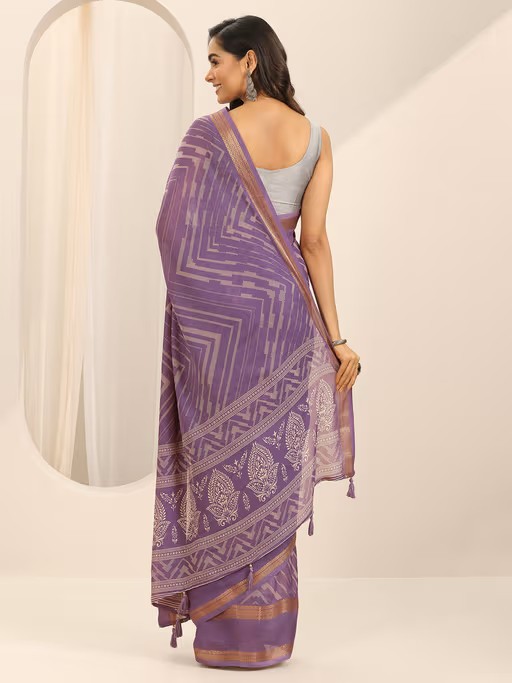 Wrap in pure bliss with this purple saree with unstitched blouse from Libas. Made from high quality poly georgette, it features printed pattern. Pair it with flats and minimal jewellery to complete your ensemble.