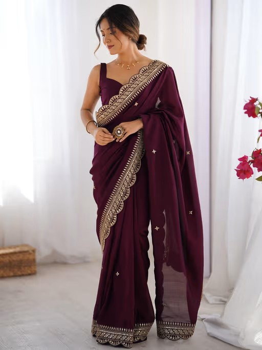 Sareemall Women Vichitra Silk Purple Embellished Saree with Unstitched Blouse