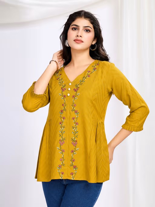 Introduce A Splash Of Elegance To Your Wardrobe with The Mojilaa Women's Mustard Pure Viscose Floral Embroidered A-Line Top. This Exquisite Piece Effortlessly Marries Classic Charm with Contemporary Flair, Ensuring You Stand Out At Every Occasion. Crafted From Luxuriant, Breathable Viscose, It Wraps You In Sublime Comfort While Offering A Flattering Drape That Accentuates Your Silhouette Beautifully.