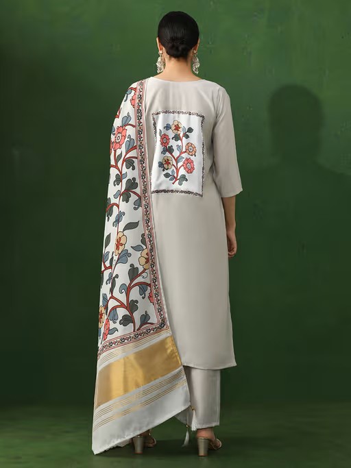 Embrace a comforting style with this Floral Chanderi Silk Off White Kurta Set. This A-Line Kurta For Women has a V-Neck, Three-Quarter Sleeves With thread work. Paired With a Pant.