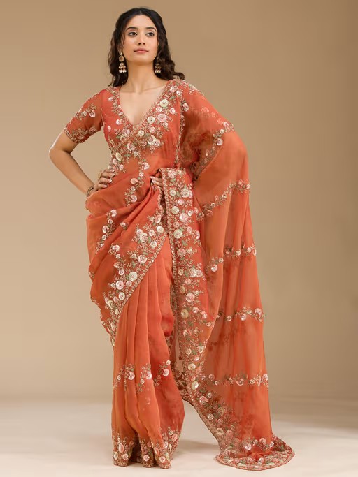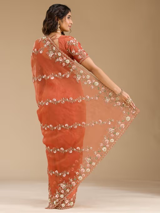 Wrap In Pure Bliss With This Rust Saree Set From Koskii. Made From High Quality Tissue, It Features Embellished/Sequined Pattern. Pair It With Flats And Minimal Jewellery To Complete Your Ensemble.