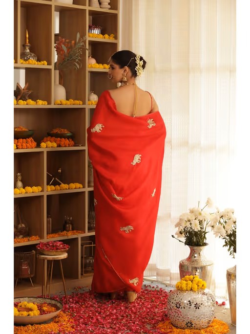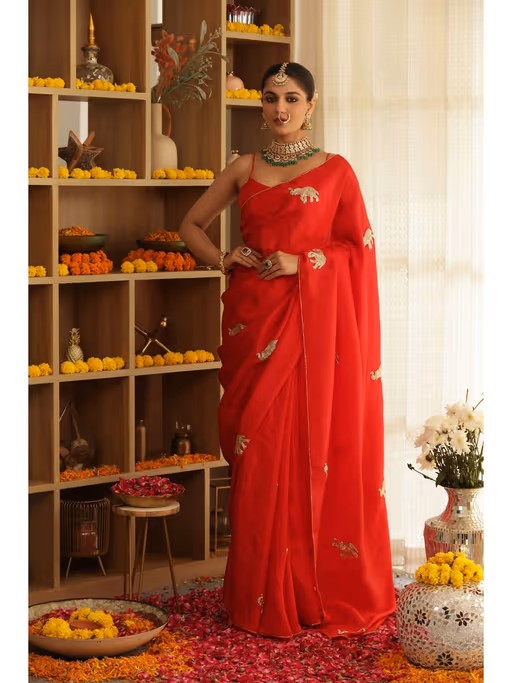 Exuding Regal Charm, The Elephant Hand Embroidered Saree Is A Masterpiece In Bride Red Upada Silk. The Intricate Cut dana Gold Elephant Motifs Symbolize Strength And Grandeur, Perfect For Traditional And Festive Occasions.