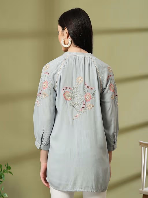 This Solid Straight Rayon Crinkle Tunic Has Mandarin Collar with Laced Front and Floral Embroidered Back Along with Three Quarter Raglan Sleeves with Embroidered Cuff.