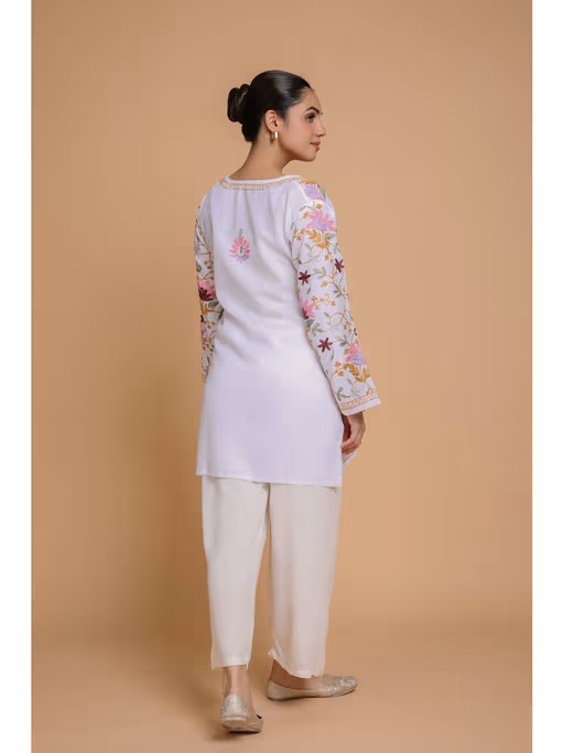 The 32-inch short kurta features exquisite Kashmiri Aari work, blending traditional craftsmanship with modern design. Its Notch neck style adds a touch of sophistication, suitable for both casual and formal wear. Crafted with precision, the Black kurta exudes purity and sophistication, complemented by the celestial inspiration of "Falak." This intricate embroidery and decorative patterns are reminiscent of Kashmir's rich cultural heritage, showcasing the region's skilled artisans. Pair with vibrant palazzos for a chic contrast or leggings for a classic look. Elevate any occasion with this timeless piece, effortlessly combining tradition and modernity.