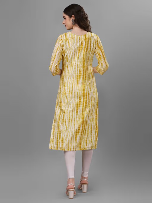 This is a One piece Kurta Color- Yellow & WhiteFabric- Pure Cotton CambricPattern- Shibori PrintNeck Type- Round Neck with VDesign Details- Shoulder princess line finished with piping. Fabric Border at the sleeve hem with piping. Wooden buttons at front. Wash Care Details- Hand washModel Details- Model is wearing S sizeDisclaimer- Slight colour variations may occur due to Screen Settings