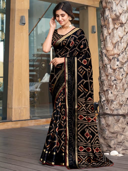 Black Cotton Ikkat Zari Bordered Printed Saree Cotton fibers are natural hollow fibers; they are soft, cool, known as breathable fibers and absorbent