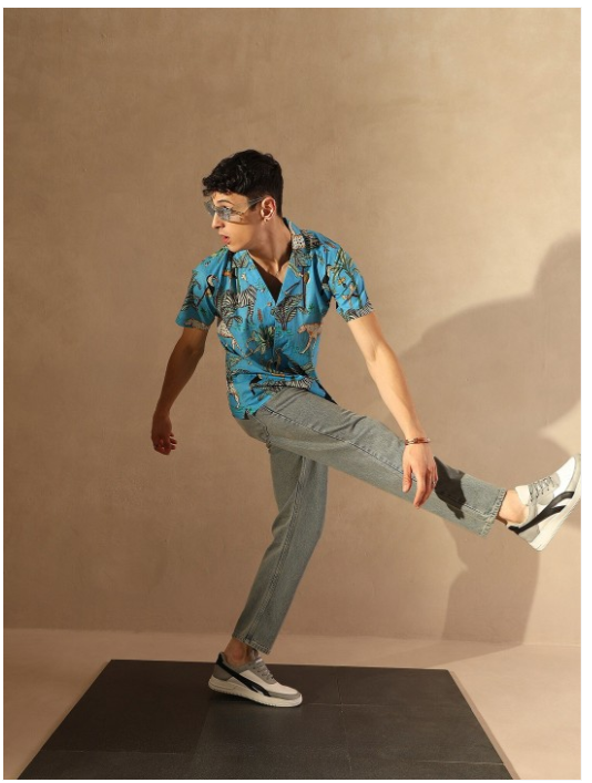 Blue tropical printed oversized Casual shirt ,has a cuban collar, button placket, na pocket, short regular sleeves, curved hem