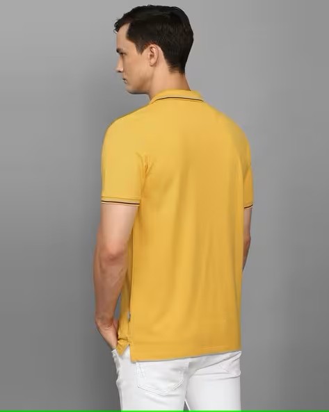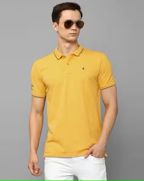 • Blend style and panache with this Yellow Solid Half Sleeves T-shirt from Louis Philippe Jeans. Crafted from fine 100% Cotton for an exquisite feel, this Polo Neck design is knitted in a Slim Fit and exudes effortless charm.
