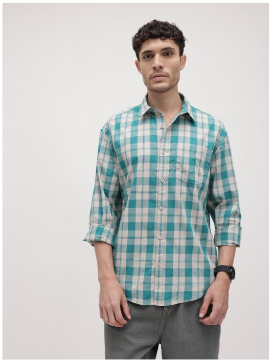Blue and offwhite tartan checks checked opaque Casual shirt, has a spread collar, button placket, 1 patch pocket, long regular sleeves, curved hem