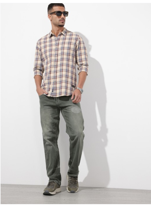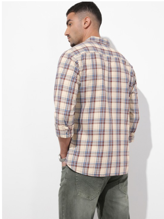 Beige checked opaque casual shirt, has a spread collar, button placket, 1 patch pocket, long regular sleeves, curved hem