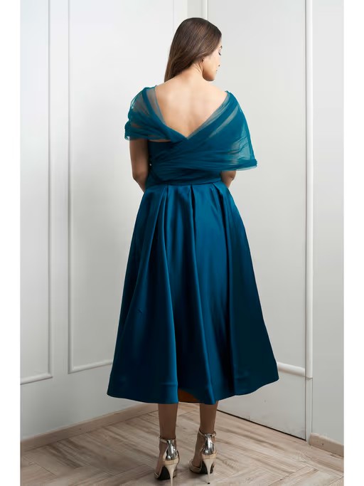 A Modest Silhouette With Tulle Detail On The Neckline. The Midi Is A Full Skirt , Full Flare Design With Substantial Size Pockets On The Sides For A Beautiful And Comfortable Look