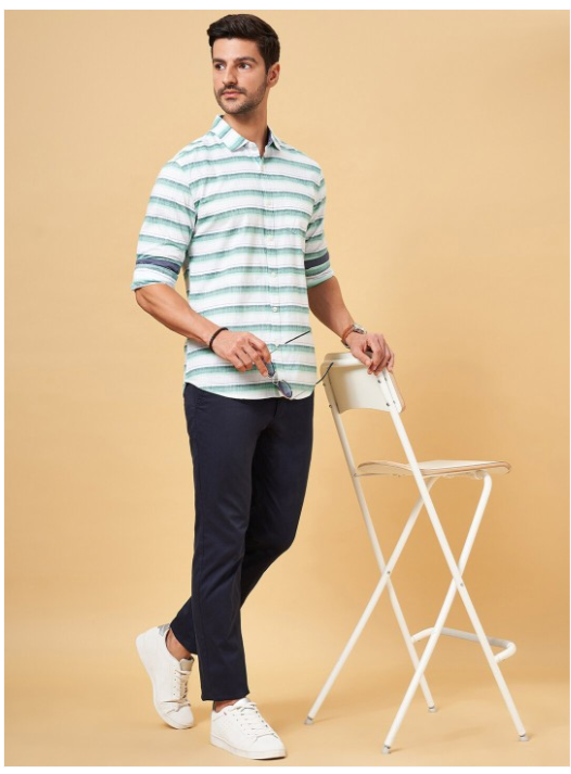 Green horizontal stripes striped opaque Casual shirt ,has a spread collar, button placket, 1 pocket, long regular sleeves, curved hem