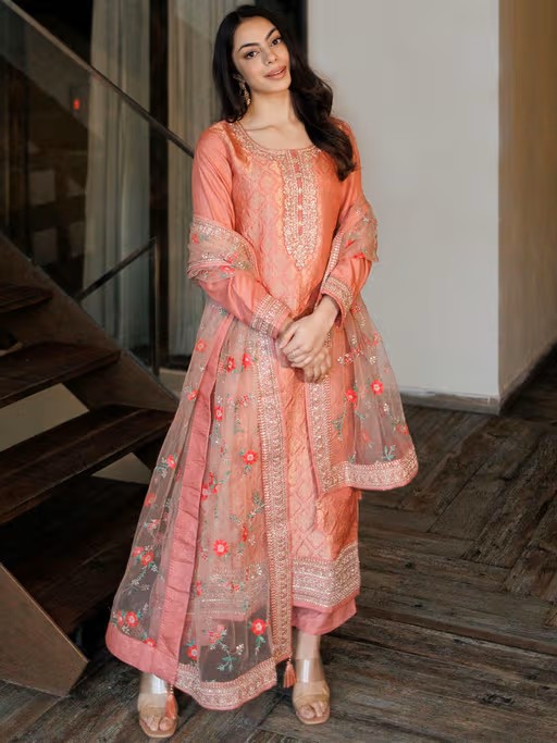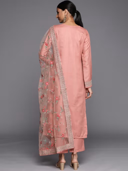 Our 3-piece pink woven design silk blend suit set features a straight-fit embroidered kurta with a round neckline, comfortable full sleeves, and a statement yoke. Complemented with trousers with a fully elasticated waistband and roomy pockets, and a dupatta. Adorned with intricate embroidery, sequins and tassel detailing, this style is perfect for festive celebrations. Style Note:Accessorise with elegant earrings, a fold-over clutch bag, and embellished juttis to complete the look.
