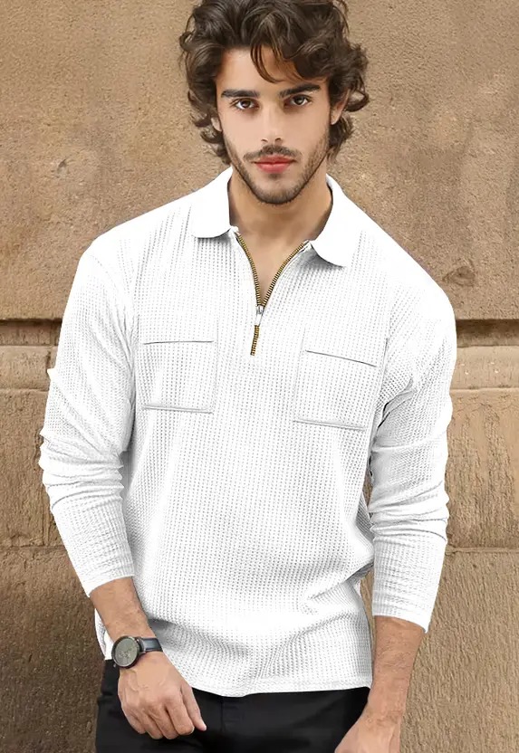 Men Solid Polo Neck Cotton Blend White T-Shirt