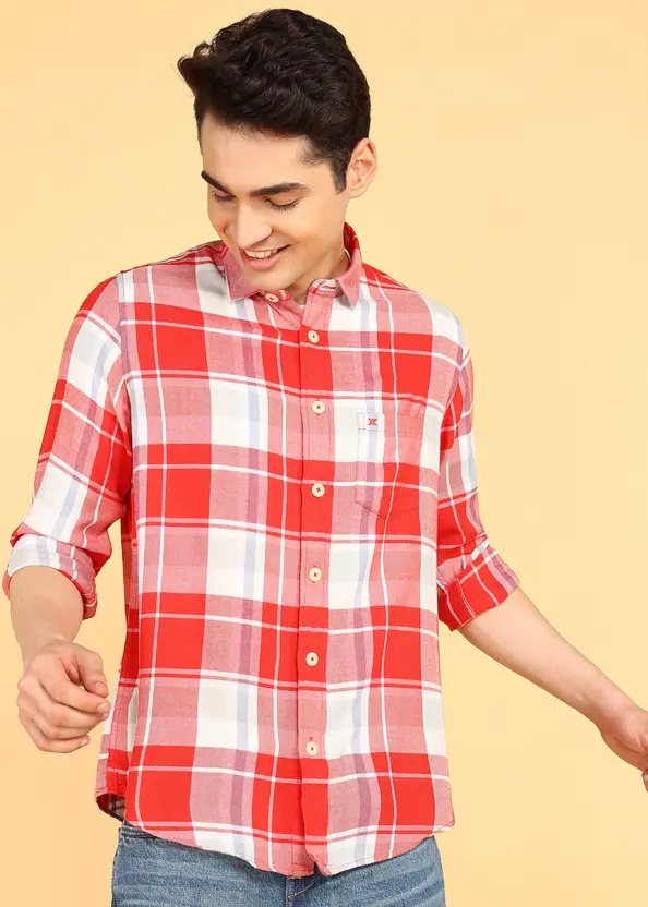 Killer Mens Red V Shape Pocket Checks Full Sleeve Casual Shirt