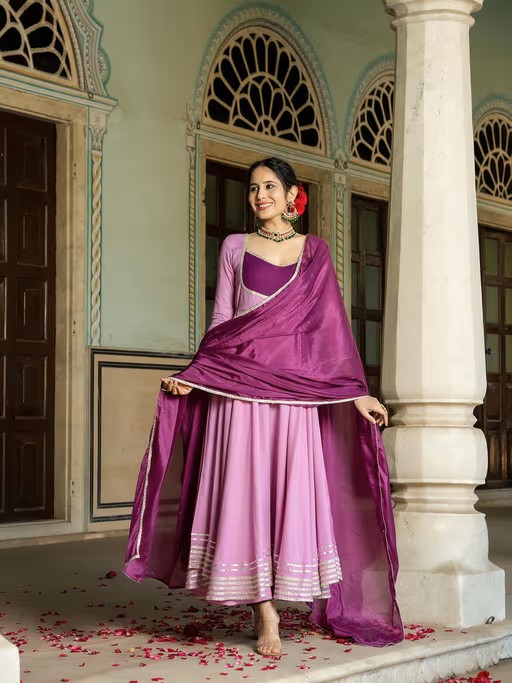 This Purple Suit Set Features A Flared Solid Anarkali Crafted with Heavy Gota Work, A Solid Pant with Elasticated Waistband and A Solid Chinon Dupatta with Gota Lace Work On Border.
