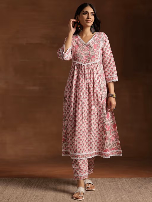Our 2-piece pink printed cotton kurta set features an A-line floral print kurta with a V-neckline and three-quarter sleeves. Complemented with printed palazzo pants with a partially elasticated waistband and roomy pockets. Highlighted with lace detailing and fabric-trim accents, this style is perfect for casual outings. Style Note:Accessorise with dangler earrings, a sling bag, and slip-on heels to complete the look.